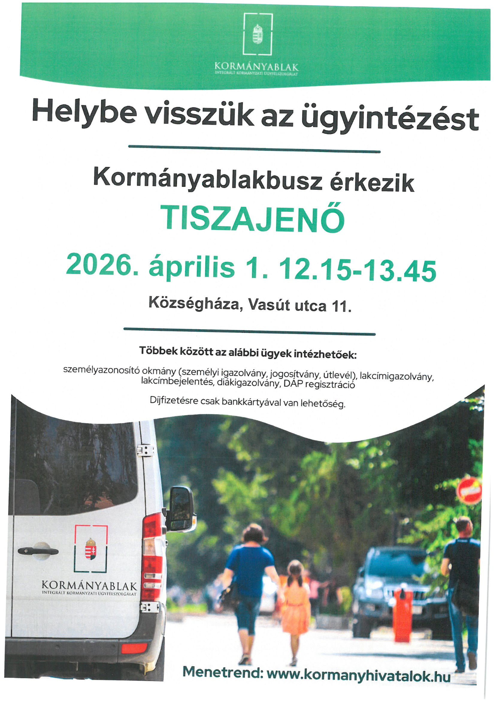 Tájékoztatjuk a Tisztelt Lakosságot, hogy a rendkívüli időjárás miatt szükséges egyes intézkedésekről szóló 2/2026.(I.14.) Korm. rendelet alapján a Kormány döntött arról, hogy a rendkívüli téli időjárásra tekintettel az állami tulajdonú gazdasági társaságoknál lévő tüzelőanyag ingyen a rászoruló családok rendelkezésére bocsátható. Felhívjuk mindazon tiszajenői lakosok figyelmét, akik még élni kívánnak ezzel a lehetőséggel, hogy igényüket legyenek…